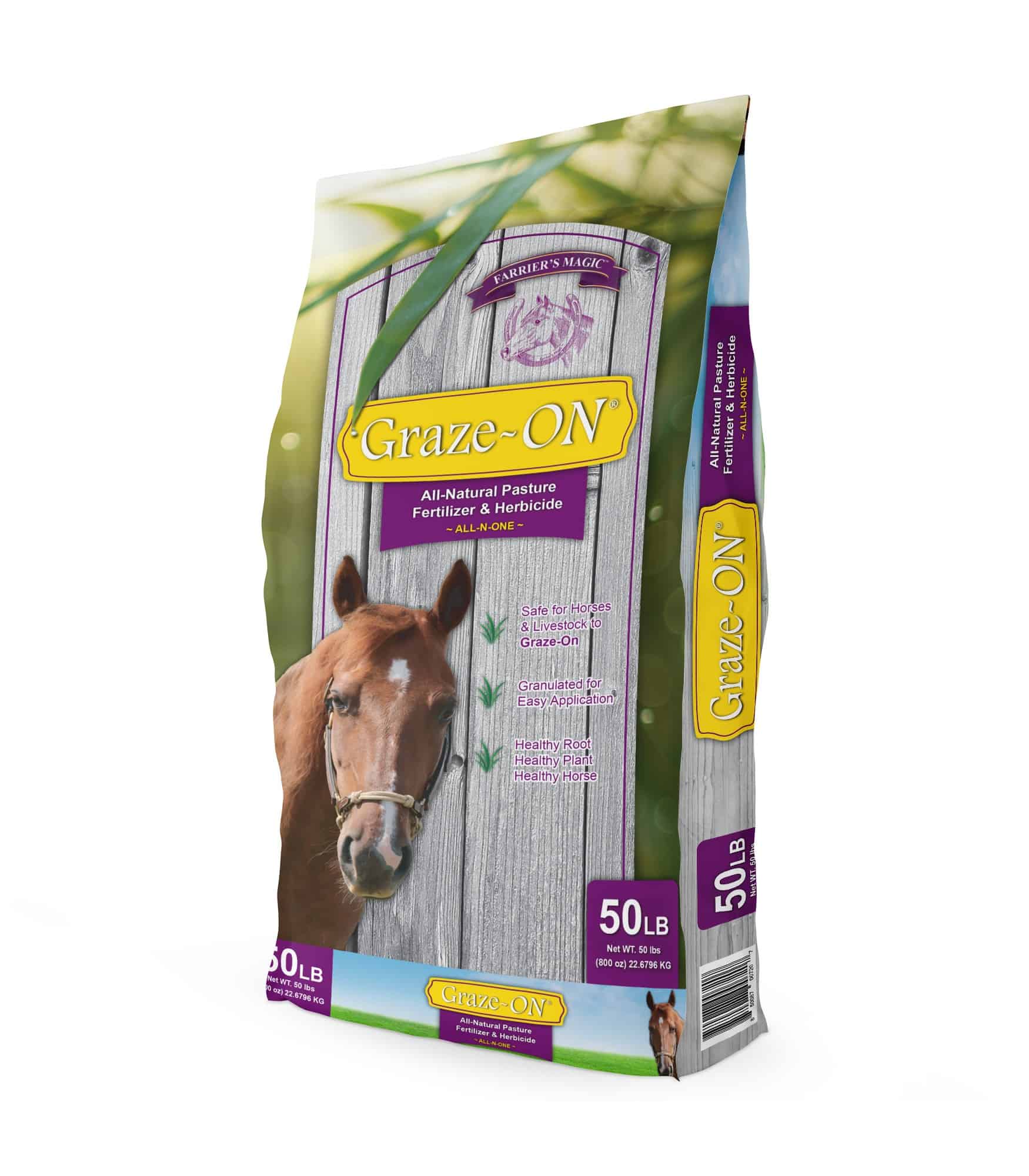 Allow your horses to graze on safely by using Farrier’s Magic Graze-ON All Natural Pasture Fertilizer & Herbicide. It’s safe for horses and livestock to graze on and promotes healthy roots,  healthy plants and healthy animals!